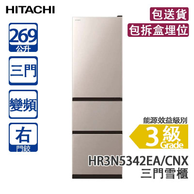 HITACHI 日立 HR3N5342EAL CNX 269公升 變頻 三門雪櫃 左門鉸/新不銹鋼香檳色 -