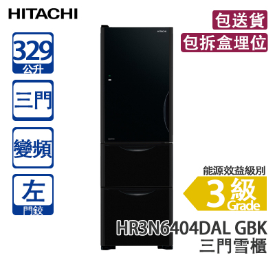 HITACHI 日立 HR3N6404DAL GBK 329L 變頻 三門雪櫃 黑影玻璃 左門鉸 窄身闊600mm/升級版高效能保濕蔬果室