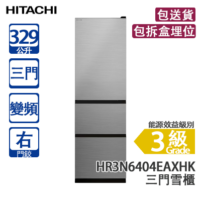 HITACHI 日立 HR3N6404EAXHK 329L 變頻 三門雪櫃 炫酷鋼灰 右門鉸 窄身闊600mm/升級版高效能保濕蔬果室