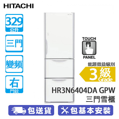 HITACHI 日立 HR3N6404DA GPW 329公升 變頻 三門雪櫃 右門鉸/白色玻璃 -