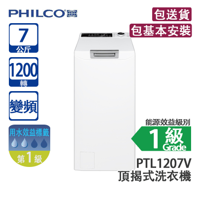 PHILCO 飛歌 PTL1207V 7公斤 1200轉 變頻 頂揭式洗衣機 防敏潔淨59分鐘